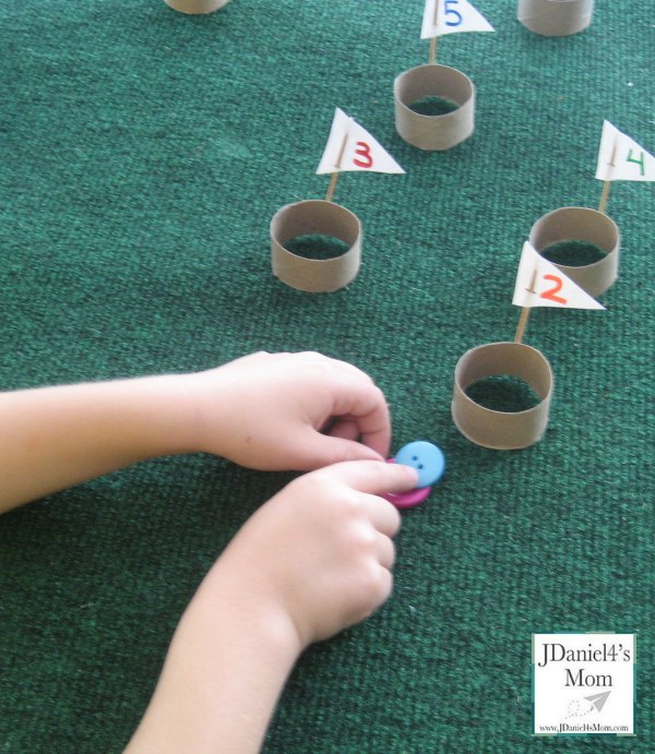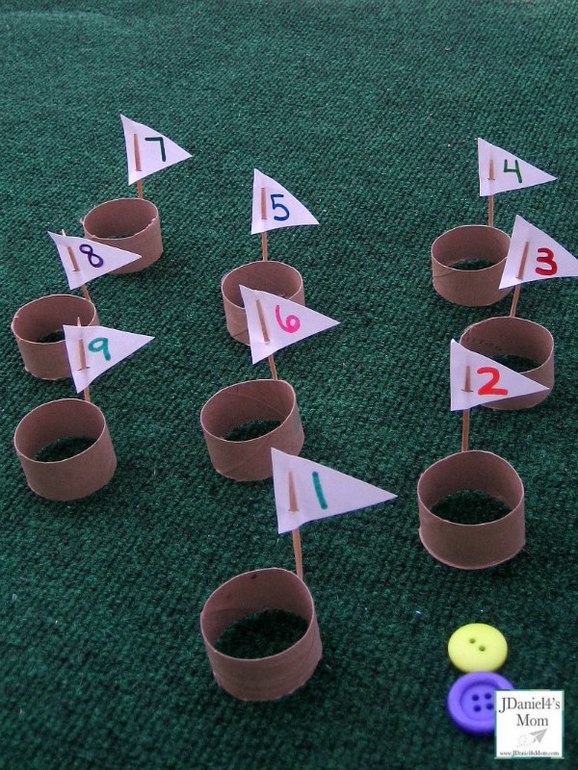 Полезные, развивающие игры и игрушкиВеселый гольф без клюшки можно организовать в любую погоду! Нарежьте из картонных рубок колечки шириной в 1-1,5 см, приклейте к каждому бумажный флажок на зубочистке с номером от 1 до 9 и расставьте «лунки» на «поле». Большие гладкие пуговицы заменят мячи и клюшку. Положите одну пуговицу на другую с небольшим смещением вперед и надавите: верхняя пуговица выскользнет и полетит вперед! Потренировавшись, можно начинать! Цель игры традиционная: отправить мяч в лунку.