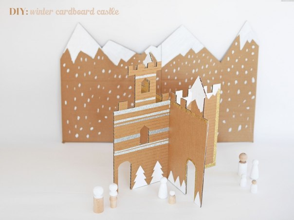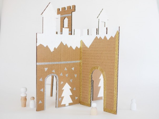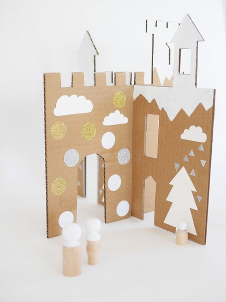 "Маленький мастер" - поделкиКартонный замок быстрой сборки выручит в любой ситуации. Шаблон вы найдете в прикрепленных файлах. Принцип создания таких замков очень прост: два прямоугольника вставляются друг в друга по центру с помощью пазов. В зависимости от кукольных потребностей замок может быть современным, историческим, сказочным, космическим, летним или зимним. Вот как можно украсить зимний дворец разными блестящими украшениями - лентой васи, краской, клеем с блеском.
