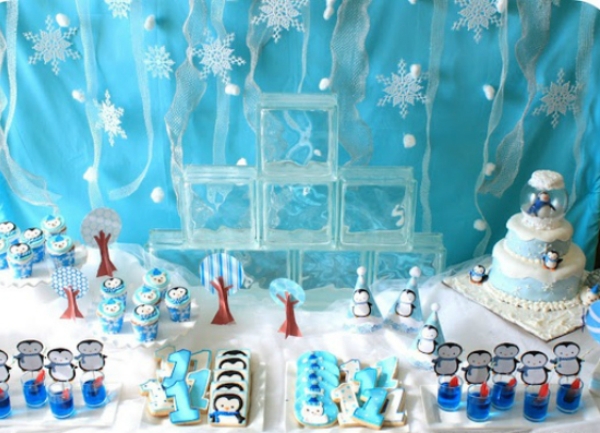 Приготовьте или купите кексы и пирожное в виде маленьких пингвинов и сувениры, запаситесь бумажными снежинками, гелевыми наклейками и аппликациями с изображением животного, которые послужат украшением для стен.