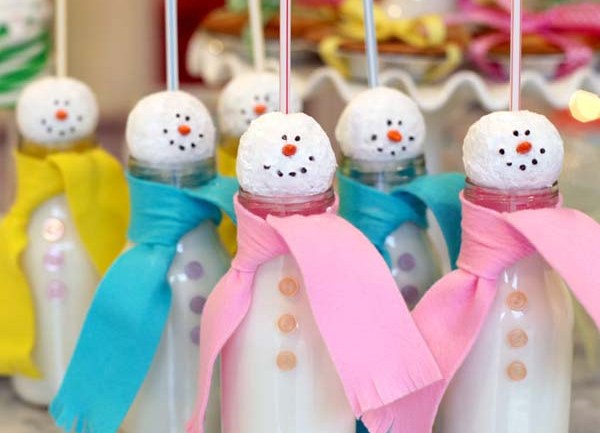 Антураж тот же. А главная изюминка праздника - это коктейли от снеговиков. Такие напитки обязательно вызовут восторг у ваших маленьких гостей. Из стеклянных бутылок и пончиков в глазури сделайте снеговиков. Горлышко оберните цветной бумажной лентой, которая станет шарфом, карамельную и шоколадную крошку используйте для глаз и носа снеговика. Заполните их молоком, мороженным и джемом.