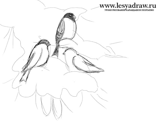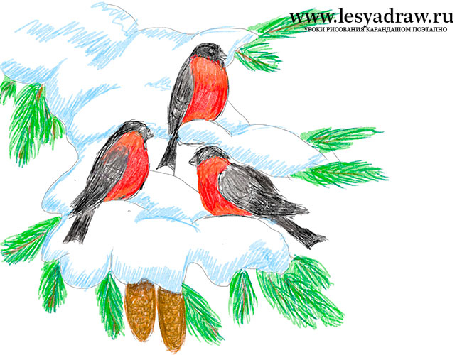 "Маленький художник" - уроки рисованияВ этом уроке мы нарисуем открытку к Новому году со снегирями или можно просто нарисовать этот рисунок на тему зиму. Итак, как нарисовать снегирей на ветке ели со снегом поэтапно карандашом. Для урока возьмите цветные карандаши или фломастеры, также можно использовать простой карандаш, не важно. Возьмем вот эту открытку.