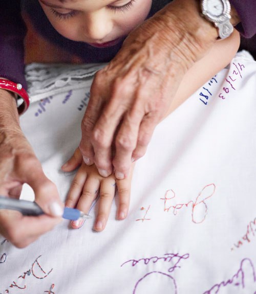 Мама - рукодельницаКогда Вивиан Палацци было уже 53 года, она решила завести одну замечательную семейную традицию. На один из праздников, к которому съехались родственники, она попросила каждого написать что-нибудь на память на новой белой скатерти. Пожелание, роспись, рисунок...