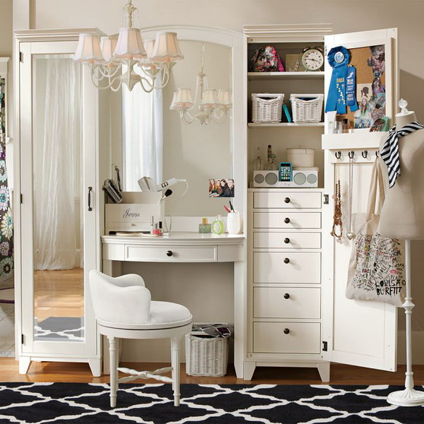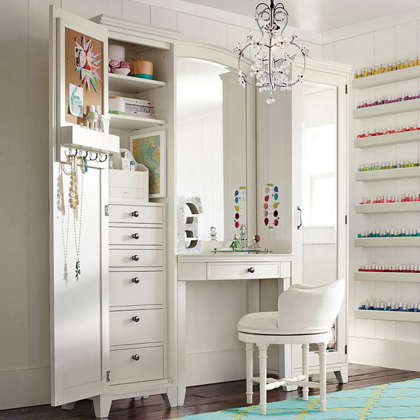 Юной принцессе понравится настоящая «Башня Красоты». Это туалетный столик, укомплектованный парой удобных стеллажей. Не думайте, что они маленькие - здесь найдется место для всех девичьих штучек. На внутреннюю сторону дверцы можно повесить бусы или любимые фотографии, снаружи - высокое зеркало.