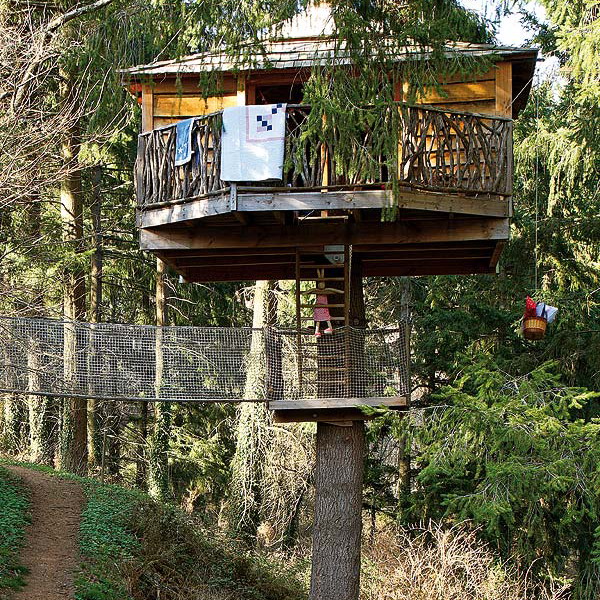 Потребуется небольшой участок земли с высоким деревом, ствол которого достаточно толстый, но при этом свободен от низких веток. Деревянный домик строится так, чтобы часть ствола дерева оказалась внутри, что особенно нравится детям: ведь в таком случае нет никакого «обмана», это действительно «гнездо»!