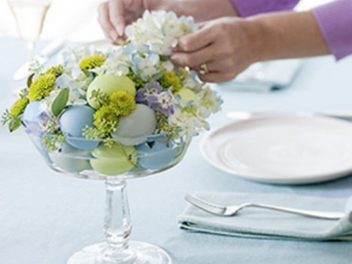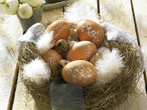 Часто для декора, например в букетах или венках, используют пустотелые яйца. Для этого острой иглой в яйце делают два отверстия друг на против друга, и выдувают его содержимое.