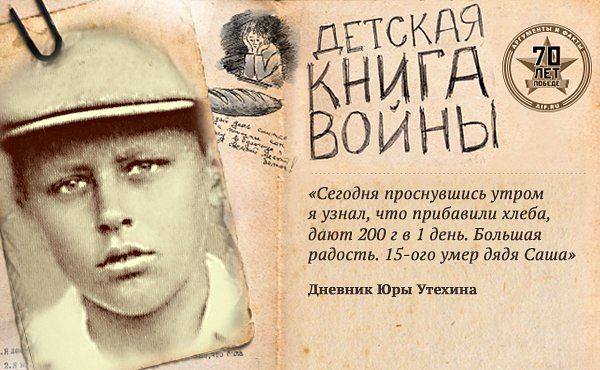 "Мир сказок" - литература11-летний Юра Утехин в годы блокады Ленинграда оказался в детском доме - родителям, врачам, приходилось работать практически круглосуточно. Его маленькая записная книжка - о том, что ели детдомовцы на завтрак, обед и ужин. Рядом с записями - рисунки окороков, сыра, бубликов. Юра мечтал, что когда война закончится, они с семьей накроют праздничный стол.