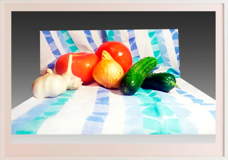Готовим композицию. Туда войдут алый помидор, зеленый огурец, золотистый лук и фактурный чеснок.