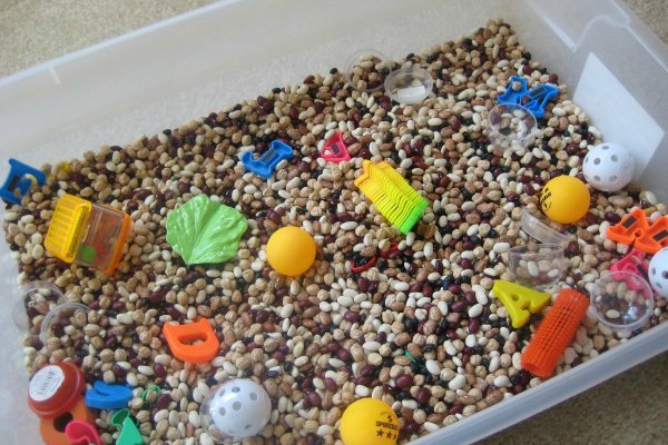 Перемешать можно манку и фасоль, тогда разделить их можно с помощью сита, предварительно продемонстрируйте этот способ малышу!