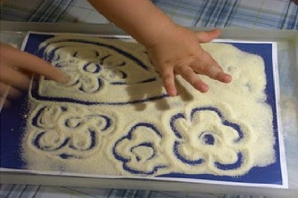 Возьмите поднос и крупу на которой будите рисовать (для рисования хорошо подойдет манка, кукурузная крупа, соль, но так же можно взять рис и гречку), равномерным слоем рассыпьте крупу по подносу. Можно рисовать! Покажите, как действовать (проведите несколько линий), предложите то же самое сделать ребенку.