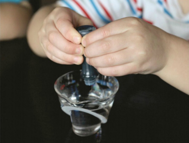 Подкрасьте небольшое количество воды, капнув в нее 4-5 капель синего пищевого красителя.