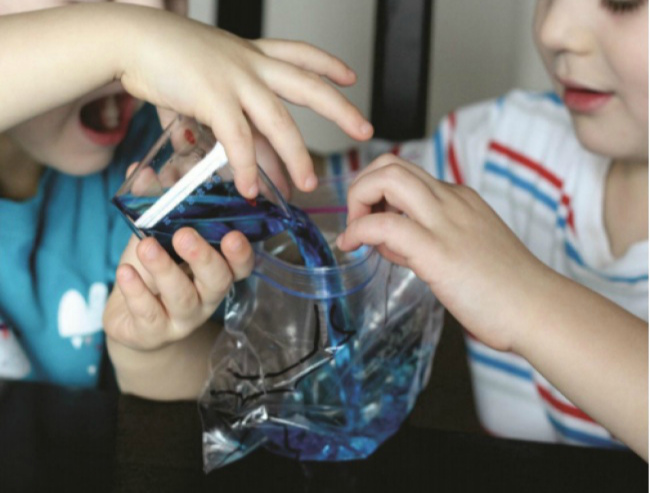 Нам потребуются один пакет на «молнии», вода, пищевой краситель синего цвета, лишние руки и немного фантазии.