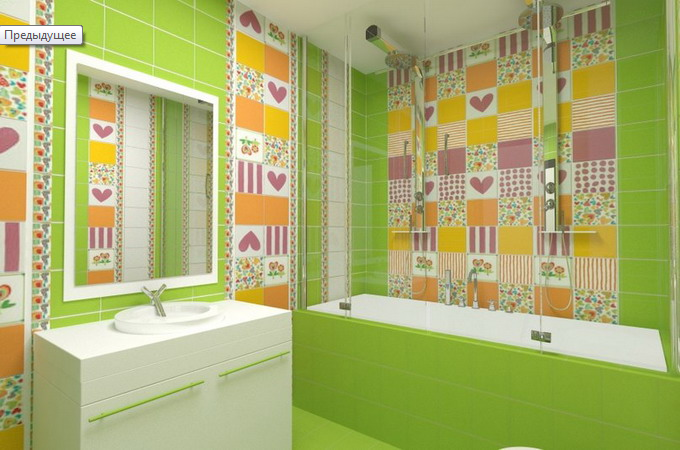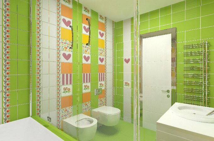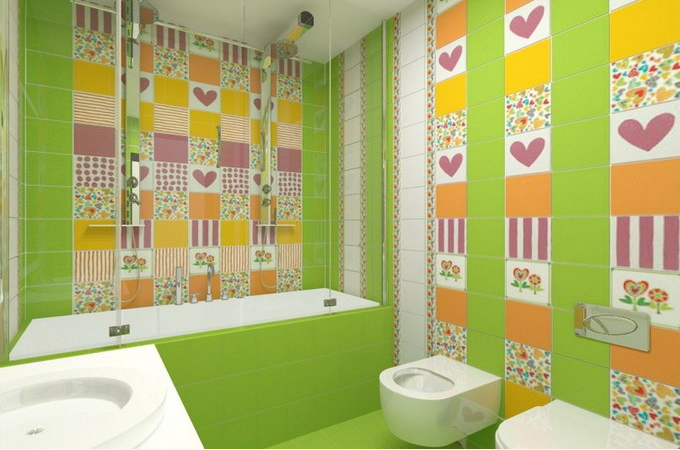 Сердечки, цветочки и другие любимые девочками узоры делают эту ванную очень приятной и симпатичной. А грамотное расположение сантехники (а здесь есть и ванна, и унитаз, и раковина) - еще и практичной.