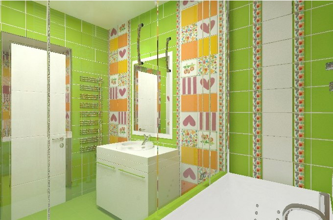 Главный цвет - зеленый, оптимистичный и бодрящий. А уже на его фоне - акценты: оранжевый, желтый и розовый. Почти каждую стену можно назвать акцентной - везде есть забавные полосочки. Но больше всего их - именно над ванной, вокруг раковины и унитаза.