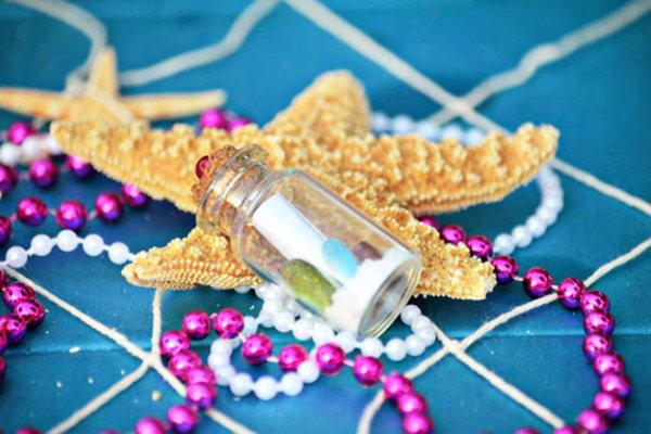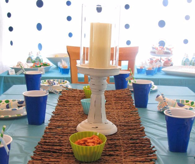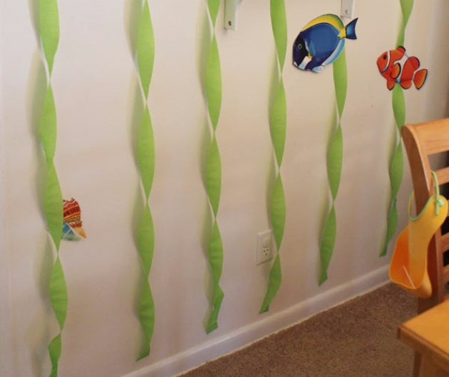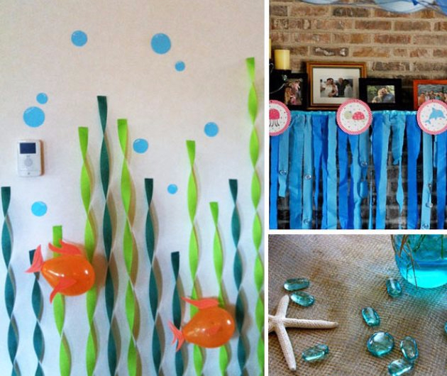 День рождение в морском стиле удобно и тем, что многие элементы можно сделать своими руками. Например, водоросли, которые растут прямо по стенам. Отрезаете длинные поперечные полоски гофрированной бумаги, чуть скручиваете и прикрепляете снизу и сверху. А перед этим, можно на стену наклеить наклейки больших и ярких рыб. На полу у стены, где растут водоросли, постелить желтый палантин и на нем расположить морское богатство: камушки, ракушки, стеклышки - вот вам и берег у моря.