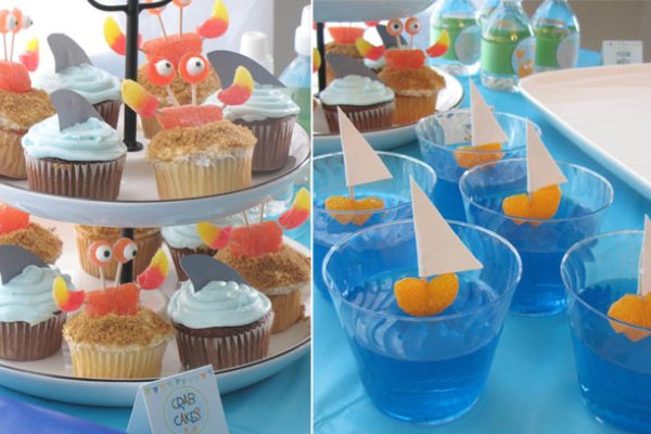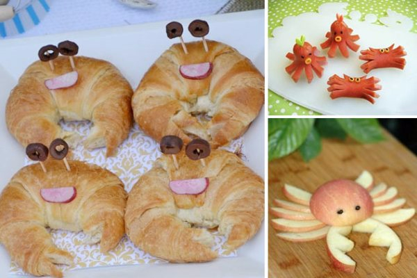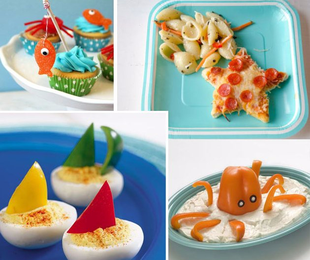 С сервировкой стола нам тоже повезло. Сколько оформлений мы можем сделать, просто правильно комбинируя кусочки овощей и фруктов. Если между двух круглых печенюшек залить крем и вложить круглую конфетку - получится ракушка. Из мастики легко слепить рыбок, из яиц - сделать кораблики, из рогаликов - крабов, а из сосисок - осьминожек. Еще можно сделать большое голубое желе и напустить туда рыбок. Выглядит как настоящий аквариум!