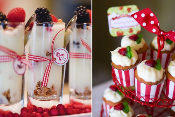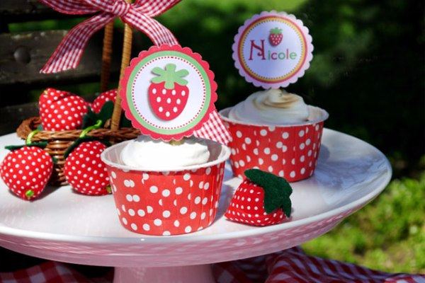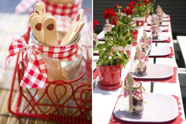 Для стола приготовьте всякие баночки и скляночки, которые можно оформить лентами или тканью в клетку или горох. Ягодное день рождение хорошо еще и тем, что на столе даже простые пакетики или баночки с садовыми и лесными ягодами будут выглядеть сказочно.