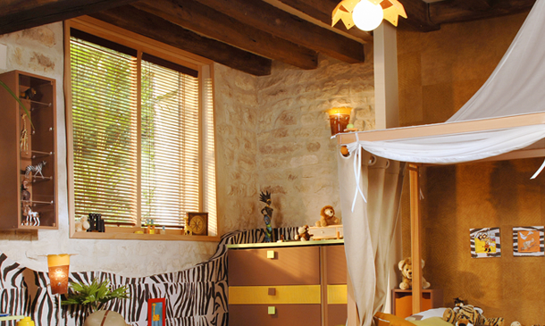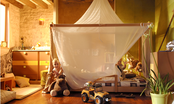 Имитация москитных сеток и навесов, обои с этническим орнаментом и коврики в виде шкур, теплая природная гамма и пара горшков с комнатными растениями сделают обстановку особенно привлекательной. Но это не реальная охота, а фото-сафари, развивающая интерес к чужим традициям.
