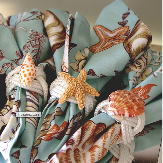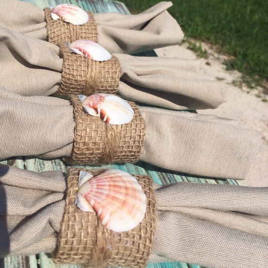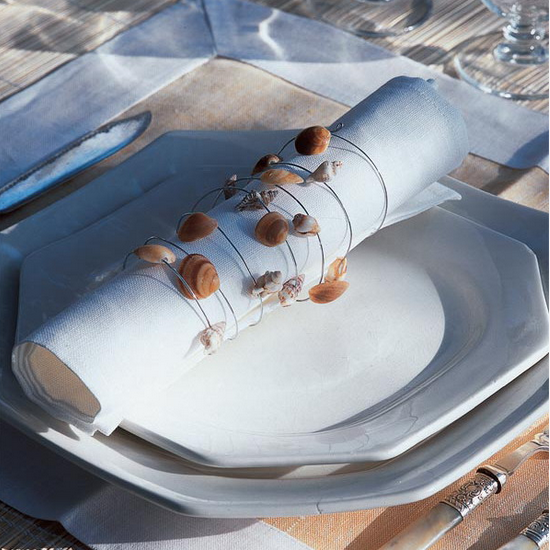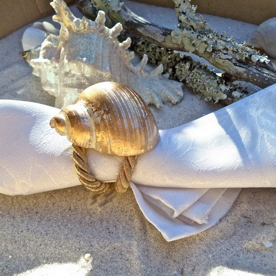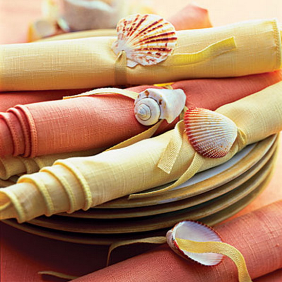 Крупные ракушки могут сами по себе стать замечательным украшением стола. Положите по одной на каждую тарелку, прикрепите ленточку с именем гостя - и восторг гарантирован. Более мелкие станут превосходным украшением колец для салфеток. Кстати, сами кольца можно сделать множеством способов.