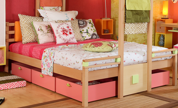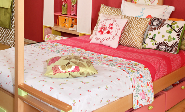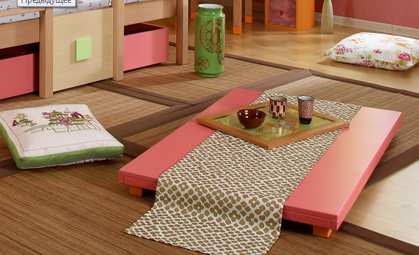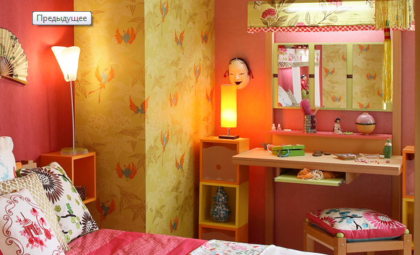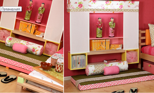 Тонкая игра на рисунках и оттенках помогает раскрыть японскую тематику на понятном для ребенка языке, приучая восхищаться поэтической красотой природы. Многоуровневый балдахин над кроватью напоминает традиционные костюмы, кушетка похожа на футон, а низкий журнальный столик приглашает к чайной церемонии. Маленький туалетный столик приучит девочку ухаживать за собой так, как этому учат в Японии, где красота возведена в ранг искусства.