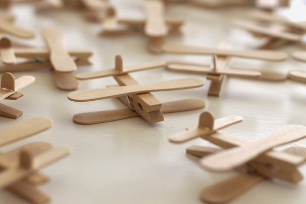"Маленький мастер" - поделкиСамолетик из палочек от мороженого разного размера и деревянной прищепки. Склеить детали можно при помощи клеевого пистолета и раскрасить акриловыми красками, а можно еще покрыть лаком.