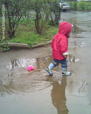 Дальше я приведу несколько примеров того, как можно играть в луже. Итак, надеваем резиновые сапоги, берем ведерко и лопатку (а мама - влажные салфетки) и идем гулять.