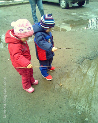 Собираясь гулять, прихватите с собой катушку ниток. А на улице найдите ровную и длинную палочку и привяжите кусок нитки к ней. Это будет удочка. Вместо крючка ко второму концу нитки привяжите что-нибудь тяжелое - шишку, камешек или какую-нибудь игрушку из дома. Дети могут на удивление долго заниматься просто "маканием" своей импровизированной удочки в луже. Когда надоест, можно задавать им задание - забросить удочку в какое-то определенное место или попытаться половить "рыбку" (подцеплять удочкой брошенные в лужу листья).