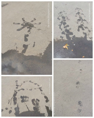 Намочите сапоги в луже, а потом делайте следы. Сравните отпечатки следов от разной обуви: своей, маминой, друзей. С помощью отпечатков "прокладывайте" тропинки из одной лужи в другую. Дети постарше могут с помощью мокрых следов рисовать целые картины - цветок, солнышко, домик, дерево, елочку.