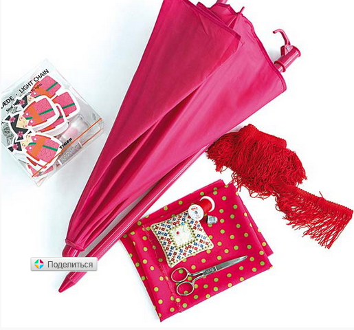 Вам потребуется: пляжный зонтик яркого цвета, ткань в тон зонтику с рисунком (например, в горошек), шелковая бахрома (измерьте окружность зонтика, чтобы рассчитать количество, скорее всего, получится около 3 метров), бумажные гирлянды, ножницы, нитки, иголки, резиновые фланцы.