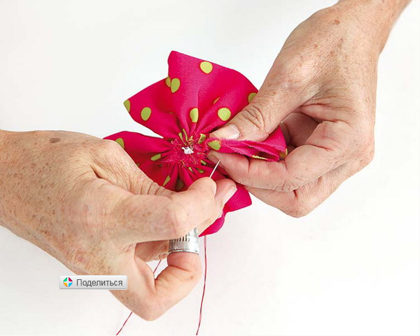- сложите вместе 2 присборенные детали, сшейте их посередине и обработайте открытые срезы, - у вас должен получиться «бантик», сделайте их несколько и пришейте к зонтику поверх бахромы, закрепляя ниткой за спицу;