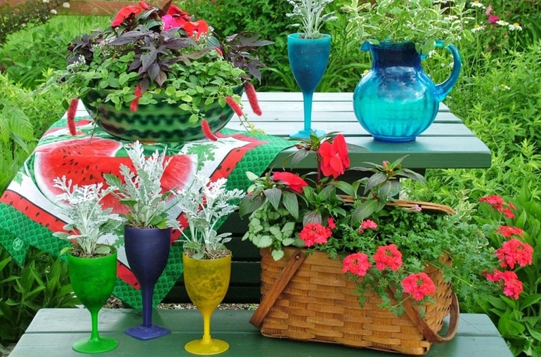 Старую посуду и корзины можно превратить в оригинальные кашпо.