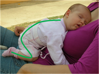 Что такое естественная поза? Это когда ножки малыша разведены не более, чем на 90 градусов (просто мысленно посмотрите на него сверху, насколько сильно его ноги обнимают вас), попа ниже колен, причем довольно глубоко НИЖЕ - таз при этом выглядит "как будто хвост поджат", спинка естественным образом в таком положении округлится.