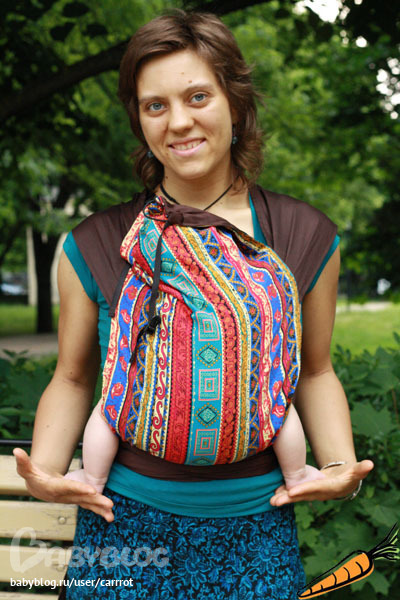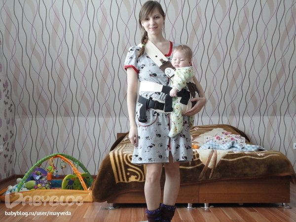 Так вот, месяц назад освоили позицию "на боку". Сажать в неё ещё легче, чем спереди. Видно, куда идёшь, ну и можно потихонечку готовить, убираться, только следить, чтобы он руку не сунул, куда не надо. Думаю, летом будем иногда так передвигаться по улице.