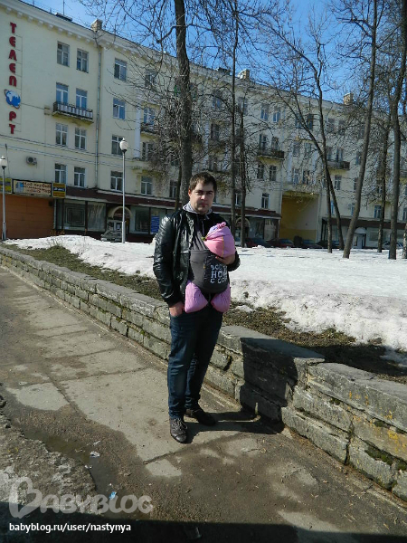 Слинг и папаМы еще с беременности были полностью уверены что станем слингородителями)))И не зря были уверены)))Папуля как только приехал с работы(3месяца его дома не было) сразу же пошел с Мирой в слинге гулять)))