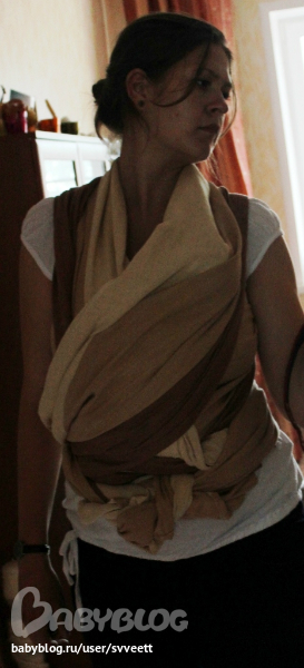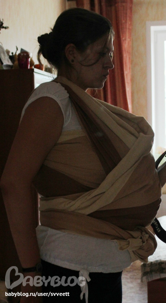 Учимся носитьПо мне так ничего на фото не видно) Больше всего за ноги переживаю, т.к. их не видно, а как надо - не ясно. Когда наклонилась, то малышка плотно была прижата. А вот под конец как будто немного ниже съехала.