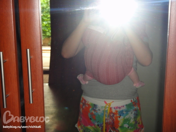 я когда ее сильно притягиваю - она хныкать начинает и вертеться....ощущение, что не нравиться... Хотя, уже несколько дней ношу вертикально в ССК, сегодня снова "посадила", а она сама ножки развела :) раньше приходилось самой..а сегодня только доделала.