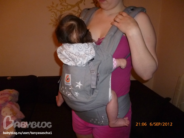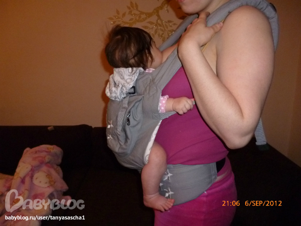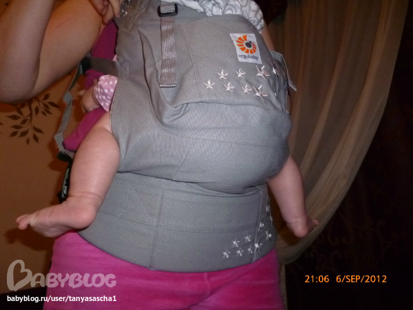 У вас получается что ребенок сидит на попе. Вам рановато еще сидеть. Надо посильнее затянуть ремни которые у вас под грудью. Тогда ребенок будет притянут к вам а не просто сидеть рядом с мамой.