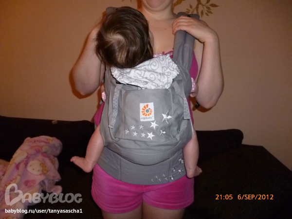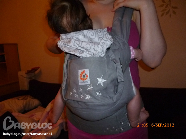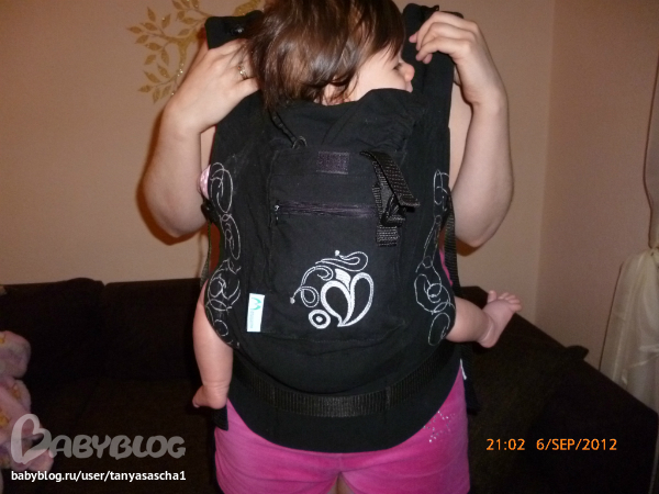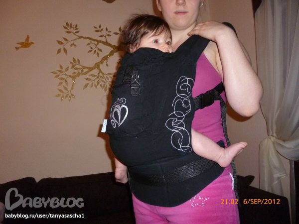 Да, до черного дорасти нужно вам... Посадка неправильная, переразвод ножек, таз малышки приплюснут. Края кармана внизу должны быть строго под коленками или выше для подросших детей. У вас они низко, из-за этого малышка чуть не сидит в шпагате.