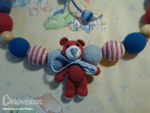 Тимка просто влюбился в эти бусы, постоянно к ним ручки тянет. Когда он не в слинге, а в кроватке под дугами коврика- вешаю бусы на дуги. А медвежонка пока сняла, жааалко. )))