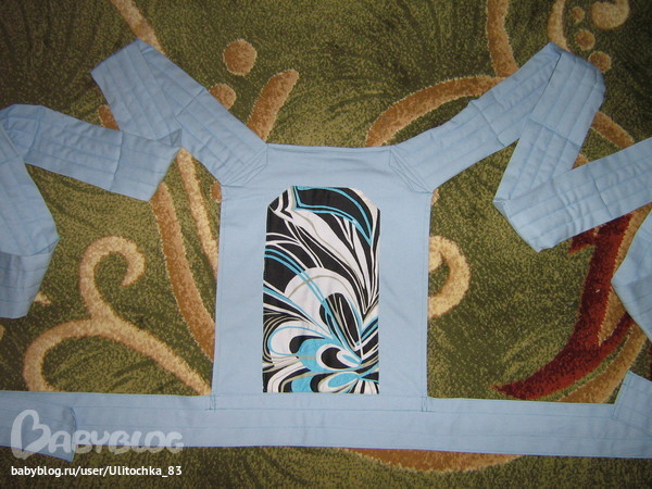 мне кажется, что лямки вшивать лучше, чтобы они шли не прямо наверх а немного в стороны к плечам, .иначе и к шее близко и в пространство между лямками только голова влезает, это может быть некомфортно ребенку и потом невозможно будет руки вытащить из слинга, просто будет тесновато.