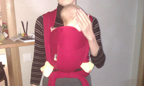 Это первый раз, когда полотно не расправленно, и как окзалось в нашем дешевом слинге так не удобно, потому что верхний край кармана слишком растянут и сползает вниз. До этого полотно всегда расправляла.