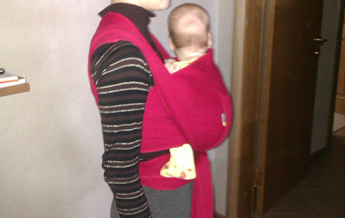 это первый раз, когда полотна разведены (так удобнее спинку округлять и снизу лучше поддерживается), обычно я их расправляю и малыш под 3 слоями ткани сидит, но головку все равно придерживаю, она у меня любознательная и ей не нравится когда слинг обзор закрывает)