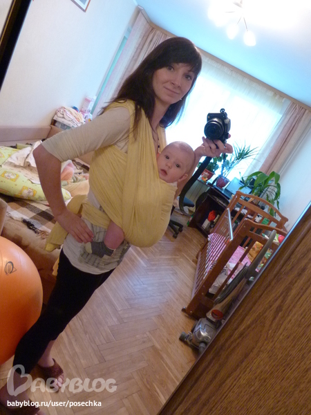 Учимся носитьОклемалась после больницы, радостно пытаюсь приспособиться к слингу) Кажется, что слишком передавливает ножки малышке, и, может, попу ниже опускать? Раскритикуйте меня.)