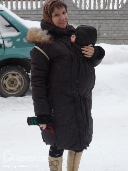 СлингоодеждаВчера мне ее привезли, и как раз с утра пришлось прогуляться в ней, т к насыпало столько снега, что с коляской дальше подъезда не уедешь. А мне старшую в сад вести на санках. Вечерком я, конечно, примерилась с лялей. Ну а с утра времени в обрез. У меня слинг-шарф елллевиль. Одела ее в слингокомбинезон, 2 шапочки, хб и вязаная, потом эту манишку с капюшоном. И куртку. Потом поняла что совершенно не въехала, как эти кнопки на воротнике застегивать, какую с какой? Вышли на улицу, ветер подул, малая в крик, застегнула там как то кнопочки, она внутри оказалась. Это я кнопку от своего воротника соединила с кнопкой на вставке. Но тогда моя шея спереди без воротника осталась. Но не дуло ничего. Потом мне показалось что я ее низко примотала. Носик был на уровне подмышки.