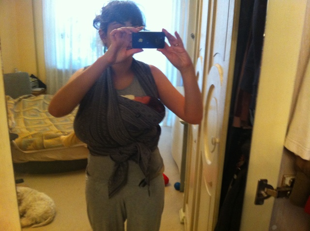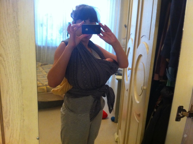 Учимся носитьПосмотрите нормально? Мне вообще было удобно,час отходили,суп и второе приготовили. Но кажется высоко намотала,да? И градь давать в таком положении невозможно, а хотелось бы.