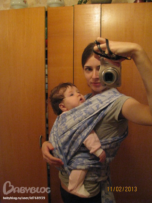 Я не очень большой спец))) Но с высоты своего полугодвалого опыта и нескольких слингоконсультаций - мне кажется слабовата намотка - может лучше покрепче мотать и натягивать полотна - полотна расправленные на спинке должны быть гладенькие, складочки - только подколенками. И я бы еще попу просадила поглубже- можно взять за стопы и потянуть ножки вверх, одновременно немного наклонившись вперед, чтобы попа "просела" - была пониже и коленочки стали заметнее выше попы- М-очкой. А так в целом для первого раза вполне)))