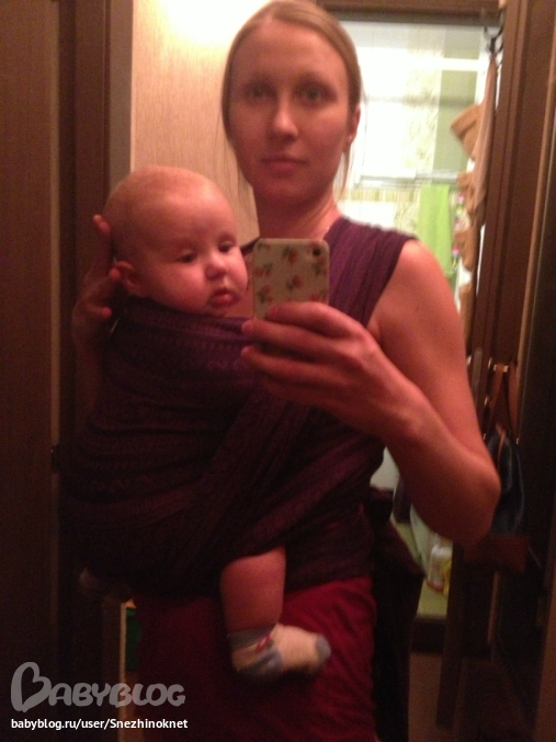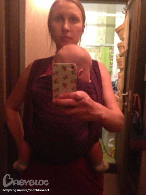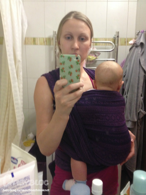 Когда примотали, то наклонитесь вперед. Если между вами и ребенком можно просунуть ладошку (то есть деть от Вас как бы отлип), значит намотка слабая. При наклоне в любые стороны ребенок не должен никуда съезжать...