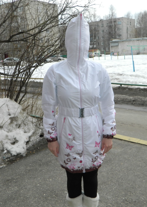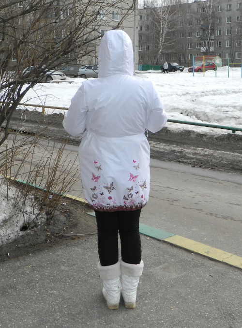 Начну с внешнего вида. Курточка очень красивая (ну вы это и сами видите). Светлая, яркая, меня видно издалека. Расцветка называется "белая с бабочками". Верх - полиэстр, внутри - мягкий флис. Тепло и уютно.