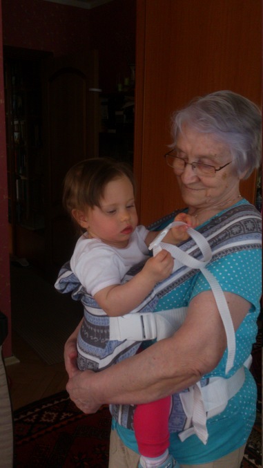Ну, увидев успех всего мероприятия, маме захотелось попробовать убедить бабушку, которая однажды намотав слинг сама, решила, что она с этими полотнищами ни в жизнь не справится, что можно транспортировать ребенка не только на руках или в коляске, но и ближе к сердцу. И вот, что у нас получилось.