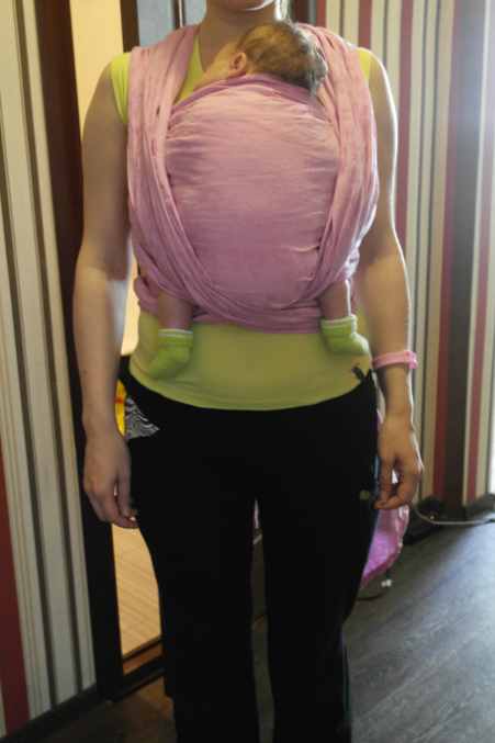 Попробовала я намотать свой 100% лен с ножками наружу и поняла, что слишком жесткий он для малышки.. Созвонилась с магазином и договорилась поменять. В итоге вот он, наш хартинесс 50 лен\50хлопок, попробовала КНК с ножками наружу. Нужна оценка