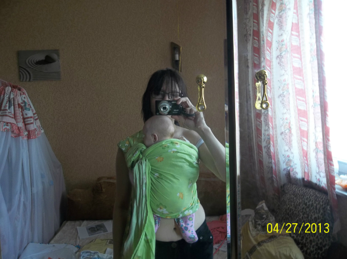 Положение "колыбель". пока кормлю ребенка грудью все нормально, но после кормления она отворачивается вниз лицом... я перекладываю ее на грудь лицом, начинаю утягивать и поправлять слинг и все. На этом я нервничаю, она просыпается и слинг снимается нафиг.